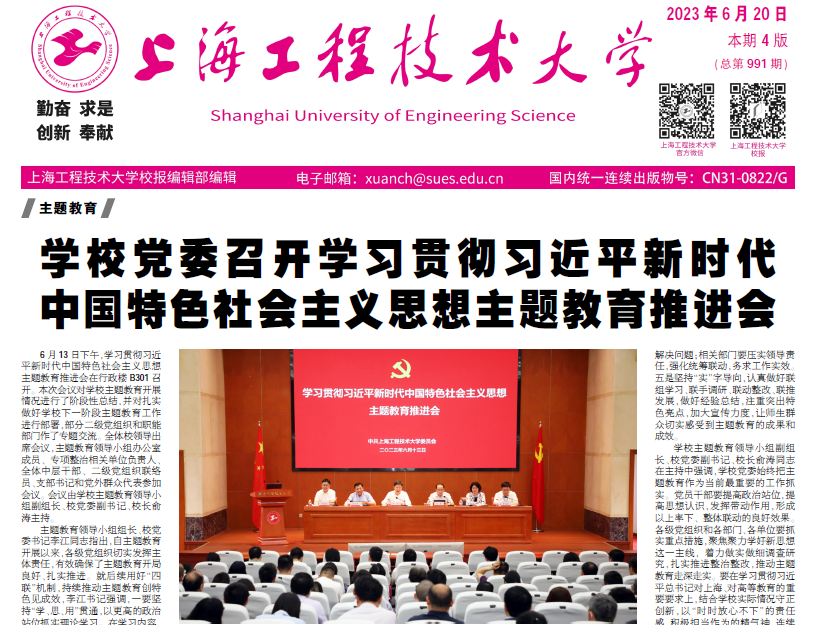 6月20日.pdf第一版【主题教育】学校党委召开学习贯彻习近平新时代中国特色社会主义思想主题教育推进会6月13日下午,学习贯彻习近平新时代中国特色社会主义思想主题教育推进会在行政楼B301召开。本次会议对学校主题教育开展情况进行了阶段性总结,并对扎实做好学校下一阶段主题教育工作进行部署,部分二级党组织和职能部门作了专题交流。全体校领导出席会议,主题教育领导小组办公室成员、专项整治相关单位负责人、全体中层干部、二级党组织联络员、支部书记和党外群众代表参加会议。会议由学校主题教育领导小组副组长、校党委副书记、校长俞涛主持。主题教育领导小组组长、校党委书记李江同志指出,自主题教育开展以来,各级党组织切实发挥主体责任,有效确保了主题教育开局良好、扎实推进。就后续用好“四联”机制,持续推动主题教育创特色见成效,李江书记强调,一要坚持“学、思、用”贯通,以更高的政治站位抓实理论学习。在学习内容、学习形式、学习要求、学习成效上持续下功夫,始终把加强党的创新理论武装作为首要任务,努力在以学铸魂、以学增智、以学正风、以学促干方面取得实实在在的成效。二要围绕“深、实、细、准、效”,以科学方法持续推进调查研