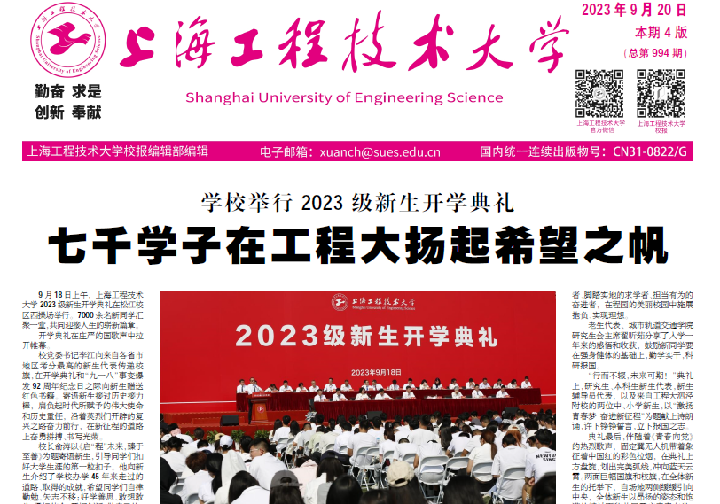 9月20日.pdf第一版学校举行2023级新生开学典礼七千学子在工程大扬起希望之帆9月18日上午,必赢76net线路官网2023级新生开学典礼在松江校区西操场举行。7000余名新同学汇聚一堂,共同迎接人生的崭新篇章。开学典礼在庄严的国歌声中拉开帷幕。校党委书记李江向来自各省市地区考分最高的新生代表传递校旗,在开学典礼和“九一八”事变爆发92周年纪念日之际向新生赠送红色书籍。寄语新生接过历史接力棒,肩负起时代所赋予的伟大使命和历史重任,沿着英烈们开辟的复兴之路奋力前行,在新征程的道路上奋勇拼搏、书写光荣。校长俞涛以《启“程”未来,臻于至善》为题寄语新生,引导同学们扣好大学生涯的第一粒扣子。他向新生介绍了学校办学45年来走过的道路、取得的成就,希望同学们自律勤勉、矢志不移;好学善思、敢想敢为;勇担使命、开拓创新,做自己的、学习的、未来的主人,在青春的赛道中乘势而上,在时代的新征程中创造无限可能。中国工程院朱高峰院士通过视频祝贺新生考入工程大,寄语同学们要立足新时代新型工业化发展,在大学里真正学习到新知识、新本事,锻炼系统性、批判性、逻辑性思维,将动脑和动手结合,提高沟通能力和学习能力,在实践中感