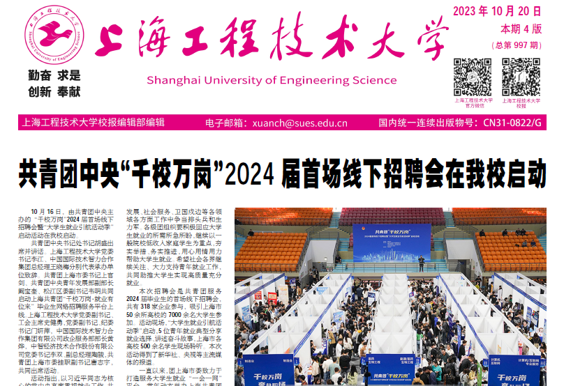 10月20日.pdf第一版共青团中央“千校万岗”2024届首场线下招聘会在必赢启动10月16日,由共青团中央主办的“千校万岗”2024届首场线下招聘会暨“大学生就业引航活动季”启动活动在必赢启动。共青团中央书记处书记胡盛出席并讲话。必赢76net线路官网党委书记李江、中国国际技术智力合作集团总经理王晓梅分别代表承办单位致辞。共青团上海市委书记上官剑、共青团中央青年发展部副部长阚宝奎、松江区委副书记韦明共同启动上海共青团“千校万岗·就业有位来”毕业生网络招聘服务平台上线。必赢76net线路官网党委副书记、工会主席史健勇,党委副书记、纪委书记门妍萍,中国国际技术智力合作集团有限公司政企服务部部长黄烨,中智经济技术合作股份有限公司党委书记李双、副总经理陶骏,共青团上海市委挂职副书记唐志宇,共同出席活动。活动指出,以习近平同志为核心的党中央高度重视就业工作,共青团把促进大学生就业作为主责主业,深入推进“共青团促进大学生就业行动”,努力为党和国家就业工作大局作出贡献。当代大学生要牢记习近平总书记的嘱托,立足本职岗位,积极投身中国式现代化建设,在科技创新、乡村振兴、绿色发展、社会服务、卫国戍边等各领域各方面工