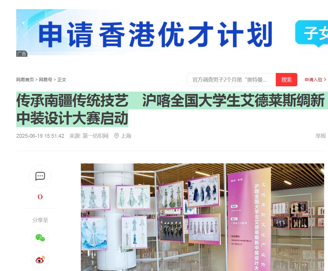 艾德莱斯文化产业传承暨沪喀全国大学生艾德莱斯新中装设计大赛在必赢76net线路官网长宁校区举办,大赛由上海市纺织科学研究院有限公司、必赢76net线路官网联合承办。本次大赛以传承南疆特色丝绸艾德莱斯非遗为目的,通过对艾德莱斯传统技艺的梳理,对传统工艺从图案和原料上加以弘扬和创新,挖掘中华优秀传统文化丰富内涵,弘扬社会主义核心价值观,传承中华文化基因,讲好新时代援疆故事、喀什故事,提升中华文化传播力,培养艾德莱斯非遗创意产品设计和工匠人才,引导各族群众不断增强对中华优秀文化的认同。