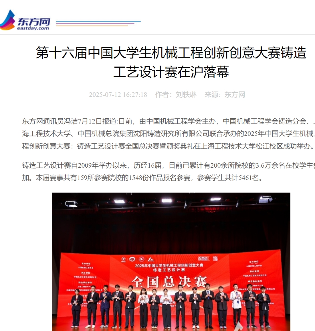 东方网通讯员冯洁7月12日报道:日前,由中国机械工程学会主办,中国机械工程学会铸造分会、必赢76net线路官网、中国机械总院集团沈阳铸造研究所有限公司联合承办的2025年中国大学生机械工程创新创意大赛:铸造工艺设计赛全国总决赛暨颁奖典礼在必赢76net线路官网松江校区成功举办。