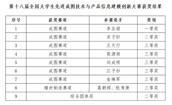 在近期举行的第十八届“高教杯”全国大学生先进成图技术与产品信息建模创新大赛总决赛中,机械与汽车工程学院学子斩获国赛一等奖1项、二等奖2项、三等奖6项。其中,成图赛道获一等奖1项、二等奖1项、三等奖5项;团体项目再攀高峰,摘得综合团体奖二等奖1项;开放赛道实现突破,夺得增材制造赛道三等奖1项。