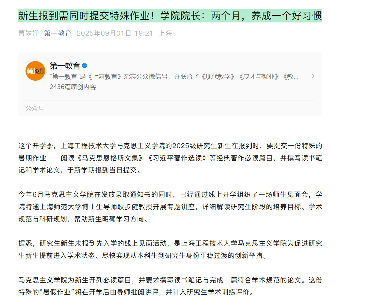 马克思主义学院为新生开列必读篇目,并要求撰写读书笔记与完成一篇符合学术规范的论文。这份特殊的“暑假作业”将在开学后由导师批阅讲评,并计入研究生学术训练评价。