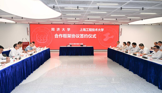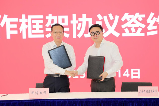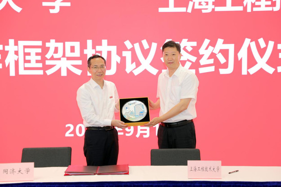 娄永琪深情回顾了两校深厚的友谊,并表达了对两校开展新一轮合作的期待。娄永琪强调,上工程伴随上海改革开放应运而生,肩负着“成为上海工业台柱”的初心使命。目前,学校正积极创建世界一流应用创新型大学,希望未来可以与同济大学共同围绕国家需求实现创新链“上下游互补”,加强在人才培养、科研转化、学科建设等方面的务实合作,全面提升“重服务 强贡献”的能力,共同携手推动上海科技创新与产业发展。杨金龙、娄永琪分别代表两校签署合作框架协议。