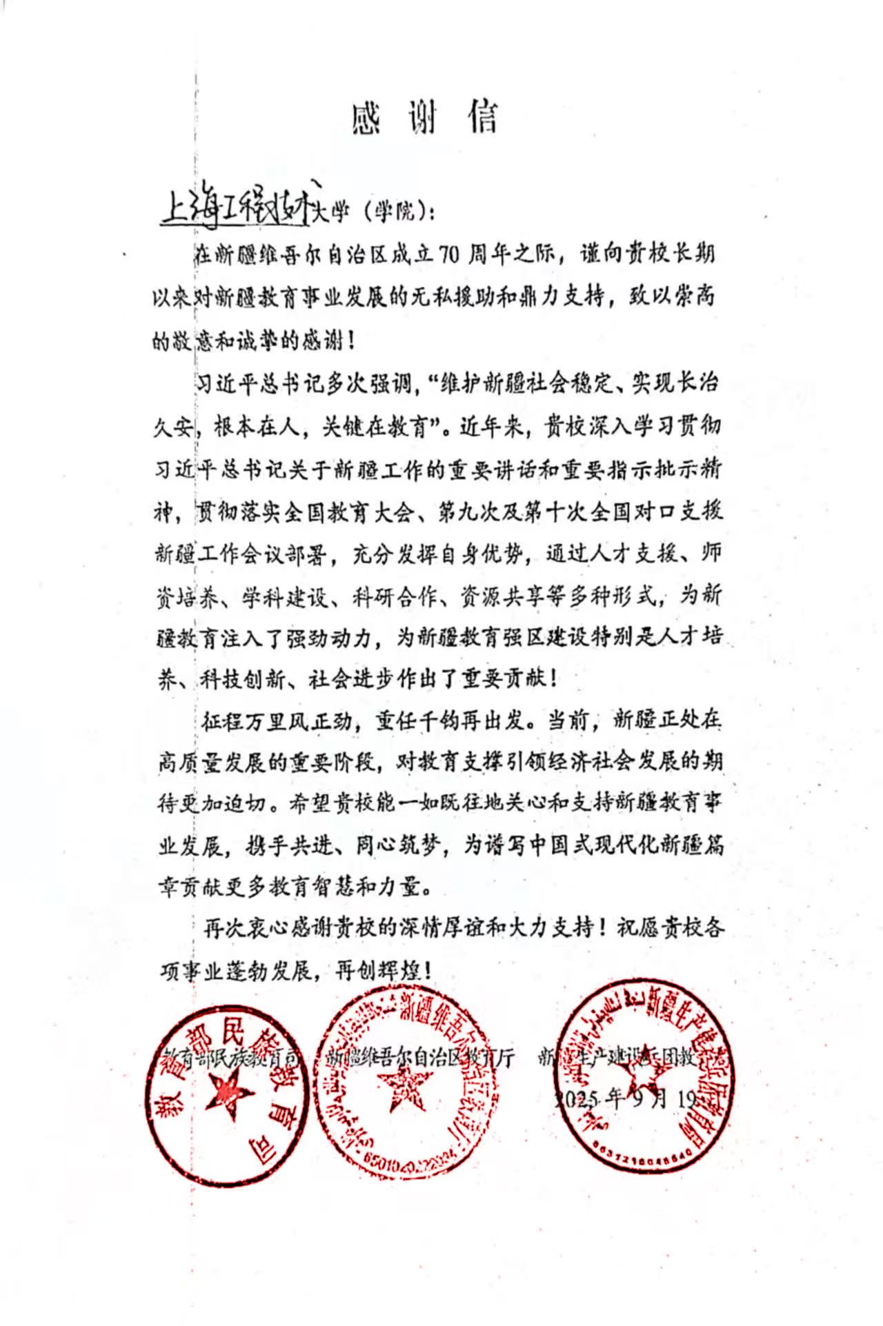 在新疆维吾尔自治区成立70周年之际,学校喜获教育部民族教育司、新疆维吾尔自治区教育厅及新疆生产建设兵团教育局联合发来的感谢信,对必赢长期以来在对口支援新疆教育事业中所作出的积极贡献表示高度认可,并致以崇高的敬意和诚挚的感谢。