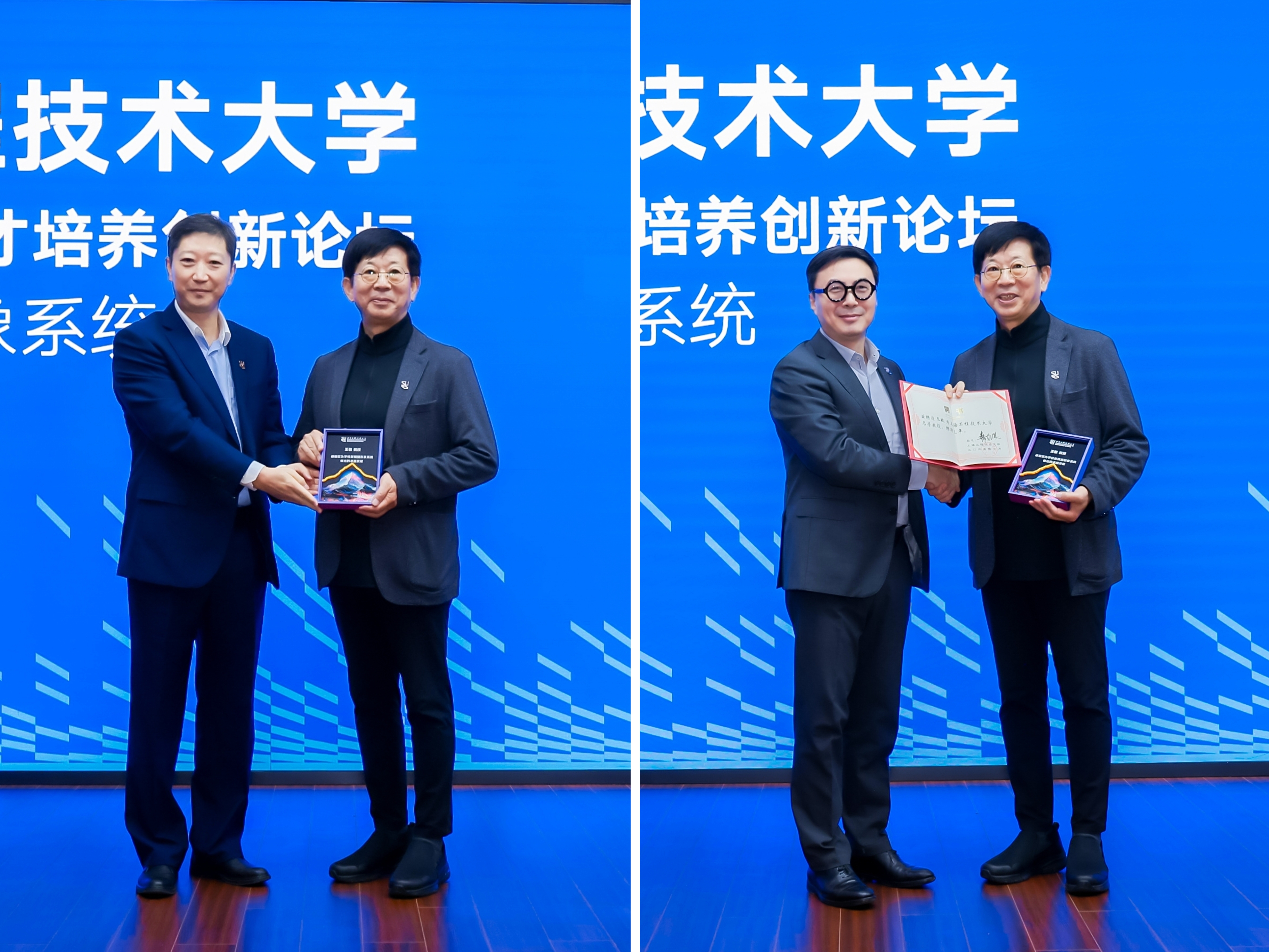 此次学校新视觉形象系统总设计师由国际著名设计学者、中央美院博士生导师、北京申奥工作艺术指导、北京奥组委形象与景观艺术总监王敏教授担任。王敏详细解读了设计理念和内涵:新校标以校名英文缩写SUES为起点,通过几何线条构建出富有动感的视觉符号,象征开放、融合与进取的精神。标志中隐含的三旋翼结构象征学科交叉融合,整体传递出学校立志建设一所与众不同的世界一流应用创新型大学的勇气和决心。李江、娄永琪为王敏颁发学校名誉教授聘书及纪念奖牌。