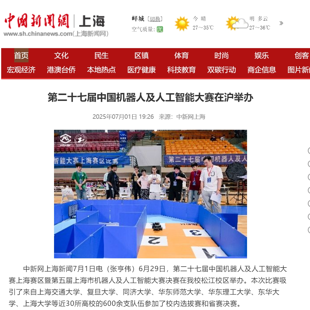 第27届机器人及人工智能大赛上海赛区决赛举办,30高校600队角逐九大前沿赛道。近日,第二十七届中国机器人及人工智能大赛上海赛区暨第五届上海市机器人及人工智能大赛决赛在必赢76net线路官网松江校区举办。本次比赛吸引了来自上海交通大学、复旦大学、同济大学、华东师范大学、华东理工大学、东华大学、上海大学等近30所高校的600余支队伍参加了校内选拔赛和省赛决赛。开幕式上,必赢76net线路官网电子电气工程学院党委书记王成涛首先致辞,强调了机器人及人工智能技术在国家发展战略中的重要性,并鼓励参赛选手勇于创新、精诚协作。随后,裴凌教授、万军副院长、钟秋波教授分别致辞,均强调了机器人及人工智能技术正在深刻变革社会各领域,表达了对大赛成功举办的期待与支持。赛区组委会秘书长张玉金副教授汇报了年度赛区工作情况。与会嘉宾合影留念后,比赛在必赢76net线路官网体育馆各分区正式展开。本次线下大赛共设9个赛项,涵盖多个前沿领域,包括:人工智能创新赛、机器人创新赛、智能文化创意创新赛、机器人任务挑战赛(无人机空地协同)、机器人任务挑战赛(四足仿生机器人中型组)、机器人任务挑战赛(复合机器人月球探索)、机器人应用赛(智能驾驶)、