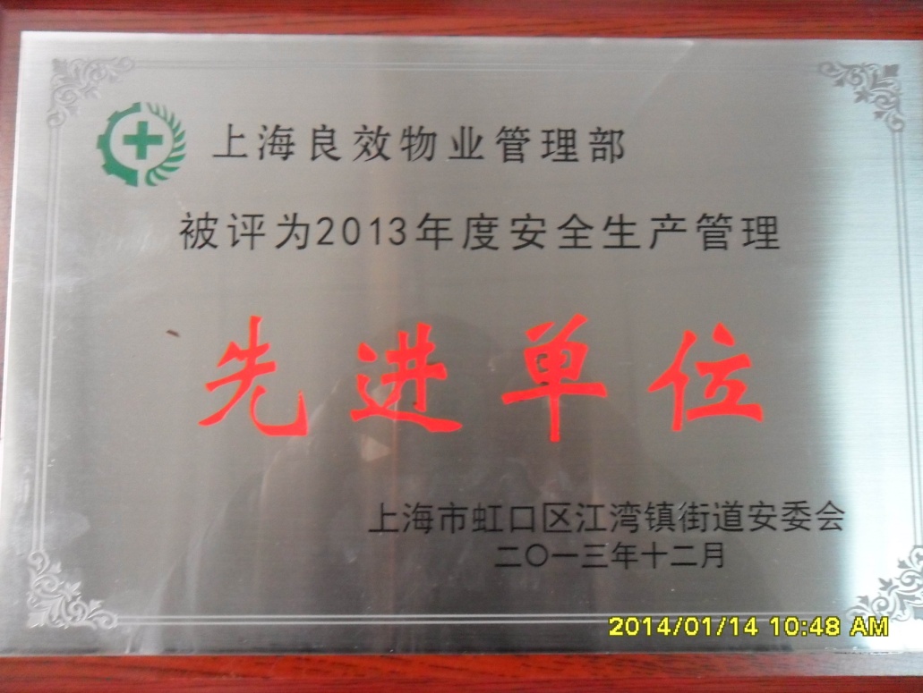 近期,高职学院、高级技校校产办良效物业被上海市虹口区江湾镇街道安委会授予“2013年度安全生产管理先进单位”。良效物业已是连续8次被评为“安全生产管理先进单位”。良效物业将进一步强化服务理念,提高服务水平,要始终把师生满意的服务作为一切工作的出发点和落脚点,将一如既往认真履行各项工作和任务,把安全生产管理工作做得更扎实有效,为校产办逐步走向正规、走向成熟,为部门的经济建设和发展树立良好的形象作出应