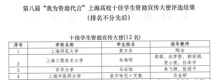 电子电气工程学院朱杨明同学荣获“上海高校十佳学生资助宣传大使”称号